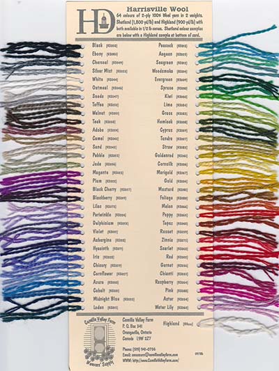 A Sample card that shows all of our Harrisville Wool Yarn colours is shown below. While it provides a fairly accurate reproduction of the colours and sizes, their appearance can vary from computer monitor to computer monitor. We suggest you verify colours with the sample card before ordering to ensure your project turns out as expected. See below for information on how you can receive our sample cards.