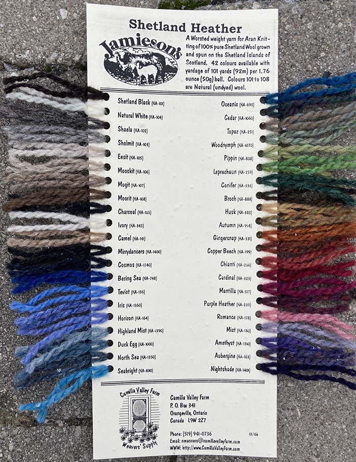 We current stock (see below) all colours of the 2-ply Spindrift, Double Knitting, Heather Aran (previously called Soft Shetland) and Lace Ultra colours.