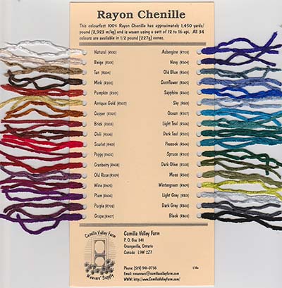 Note that a number of the Rayon Chenille colours match those used in our Tencel yarn enabling the weaver to create many effects by mixing the two yarns in the warp or weft.