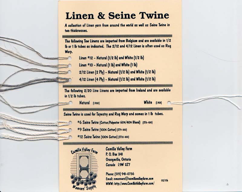 Camilla Valley Farm Weavers' Supply provides a selection of Seine Twine for Weavers. Used for Tapestry and/or Rug Warp, this strong twine comes in three weights. The #6 weight is a Cotton/Polyester (60%/40%) blend while the #9 and #12 weight are 100% cotton. This yarn is a available in natural only: