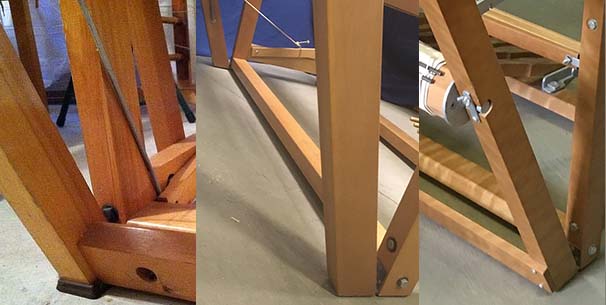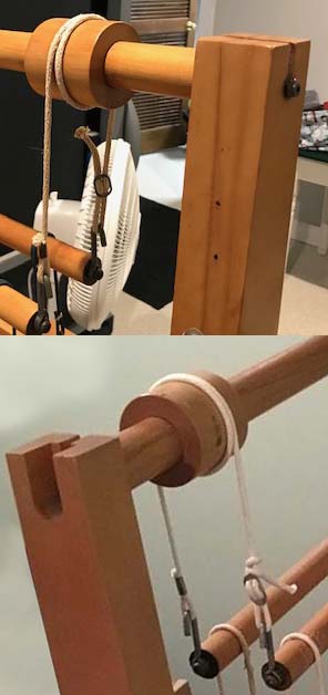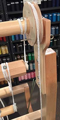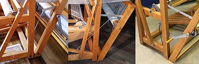 To reduce the amount of force required to press down on the brake treadle and to make the shafts return more easily to the neutral position, Leclerc added "frictionless" nylon bearings to the upper roller mounts. As well as making treadling easier, this improvement helped when low warp tension was being used or when narrow fabric was being woven.