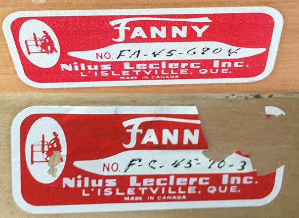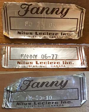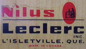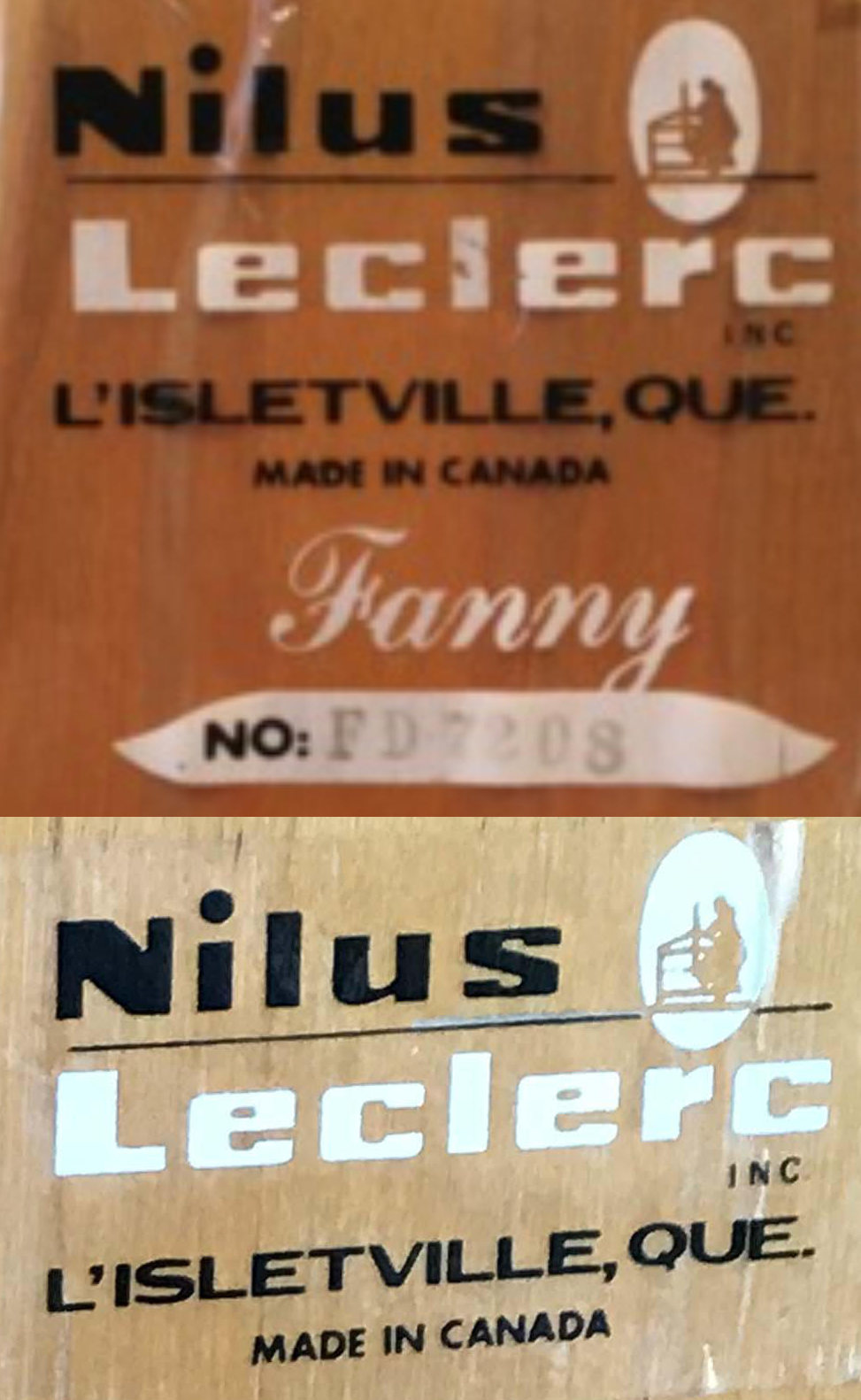 The Leclerc logo on looms has changed over the years to reflect the company's changing name and the name of the location it is based in. The logo on a Fanny or F-type is normally found on either side of the loom on the outside of the vertical castle. Most looms will say "Nilus Leclerc" but newer looms (from the late 1970's onward) will say "Leclerc" as the company name changed over the years. The first two logos do not apply to the Fanny or F-Type as they pre-date this model.