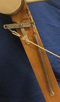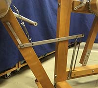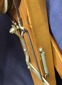 The current brake system, like the Reverse Friction Brake, replaces the brake cord and uses a longer lever to make it easier to depress the treadle. A turnbuckle is used to allow the weaver to adjust the brake to minimize the amount of treadle movement is required to release it. |