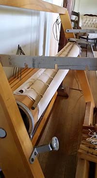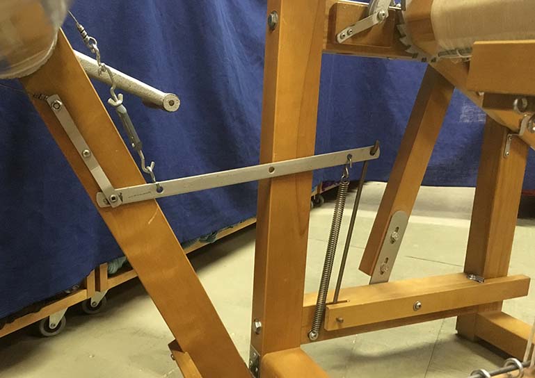 The ratchet mechanism was connected to the wooden foot treadle on the right side of the loom under the cloth beam and the tension could be controlled by rotating the metal knob.