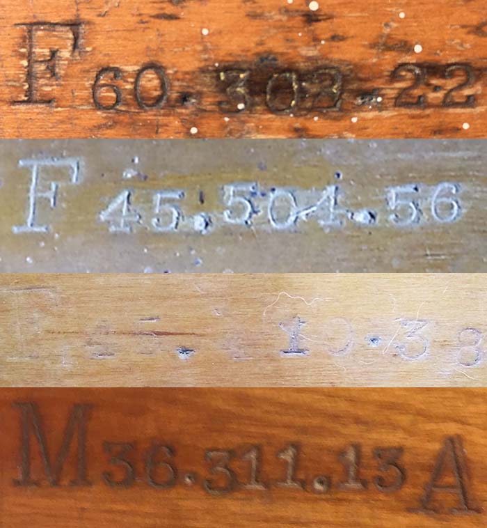 The older F-type looms (and M-type) usually had a number stamped into the wooden frame that gave some information. This was usually located at one side of the beam that the treadle were attached to at the weavers feet.