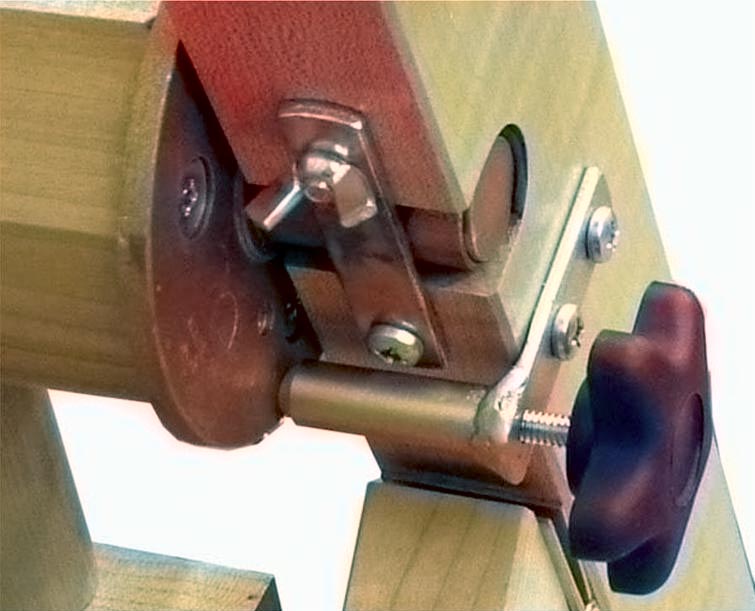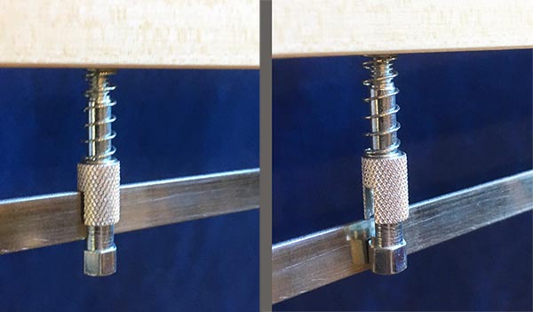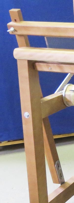 Double Warp Beam The extra warp beam is easy to install with brackets on the back posts of the loom, and comes with it's own friction brake which can be operated by the weaver sitting at the loom. On floor looms, this feature eliminates the need for the weaver to get up and walk around to the back of the loom to release the tension to advance the warp. The warp threads travelling to the second beam travel over a special secondary thread beam which mounts to the main thread beam and seperates the two warp threads. This beam and the mounting brackets for it are also included. The second warp beam is removable if not in use. |