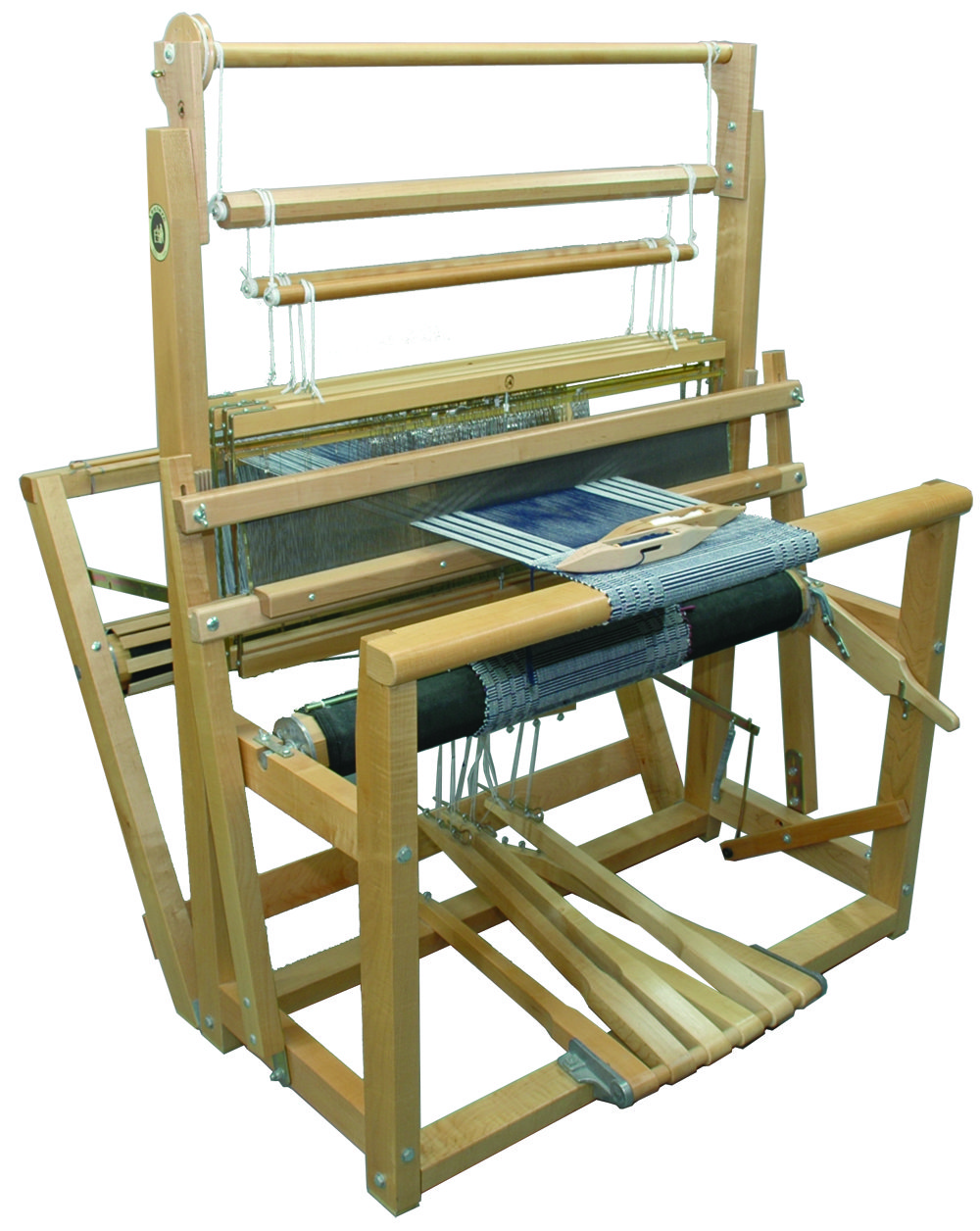 The counterbalance shed is wide and clean on every pick for the full range of 4 shaft weaves and the heavy duty cloth beam ratchet mechanism and warp beam friction brake enable the weaver to put a high tension on the warp. Both the breast beams and the cloth beam can be easily removed in a few minutes and optional rakes can be added to the warp beam to turn it into a Sectional Warp Beam. A selection of benches and other accessories are also offered.