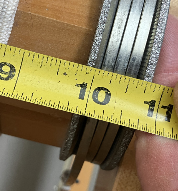 The larger Brake Circle fits floor looms like the Fanny, Mira, Nilus, Nilus II, Artisat, Weavebird, Colonial, Nilart and a number of others. The current large Brake Circle design uses a flat metal strip that is wider than the original ones which used round wire like the small Brake Circle. This gives it a better grip for more braking strength but is wider than the older ones so it is a good idea to check the width of the Brake Drum on very old looms to make sure they can be used with the Brake Circle. This picture shows how the Brake Circle needs a little bit more than 1/2 inch to operate properly and not bind together.