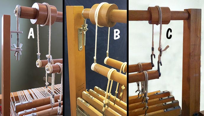 There are 3 sets of upper roller cords that are designed to fit looms configured with the 3 primary ways the upper roller was attached to the frame (all three are shown below). The current "C" shaped (A) and the older "L" shaped (B) brackets allow the height of the shafts to be adjusted by moving the upper roller up and down. On the older looms with the fixed height roller (C), the cord length is adjustable. On these looms, the upper cords also replace the hooks on the end of the lower roller with the improved nylon pulley system.