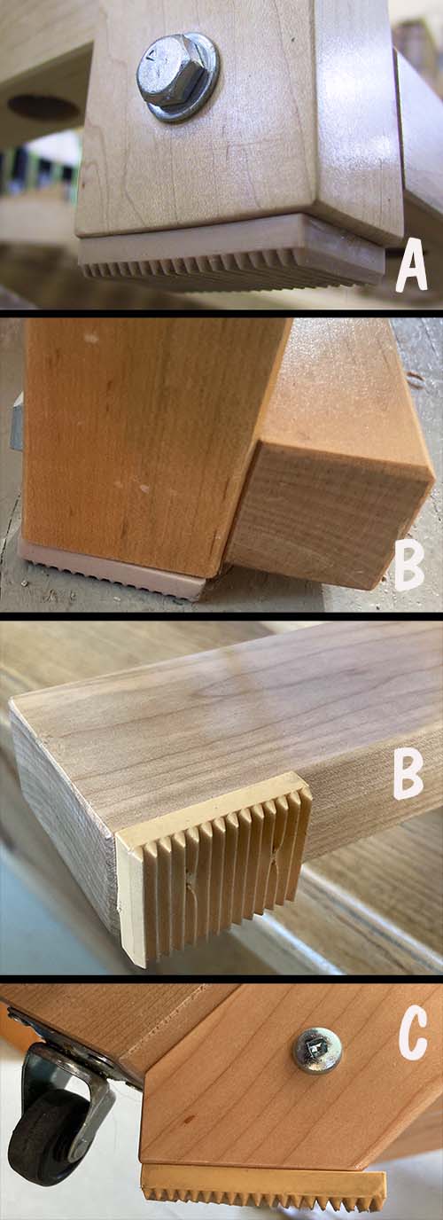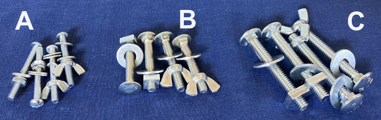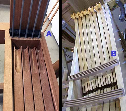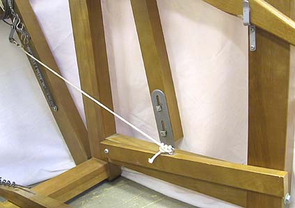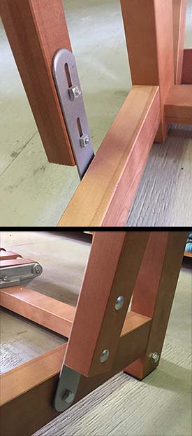 An alternative set "B" is for newer looms where instead of a screw to fasten them, a bolt goes right through the frame and a square nut and a wingnut are attached to the end on the outside. Note that this design required that countersunk holes be drilled into the inside of the frame to ensure the bolt head does not interfere with the brake treadle.
