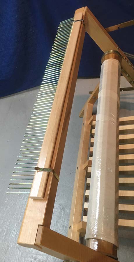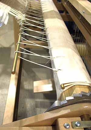 These metal or wooden rods are used instead of canvas aprons to attach the warp threads to the warp and cloth beams. They have a series of holes which are used to tie it to the warp/cloth beam using a lashing cord. Normally 2 are shipped with each loom except the Artisat which uses a Beam Stick on the Warp Beam and an Apron on the Cloth Beam.