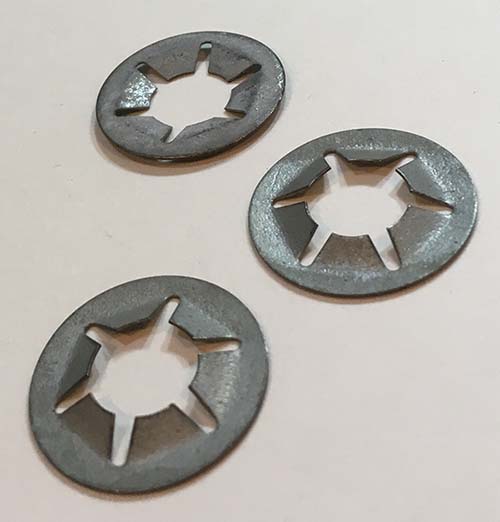 On most Leclerc floor looms like the Fanny, Mira, Nilus and Nilus II the treadle set is mounted using two brackets which attach to the frame. The metal treadle rod is attached to the bracket on one side, but just fits through a hole in the other side to allow the treadle parts to be removed. To keep the rod from coming out of the bracket, a flat metal lock nut is inserted on the outside end of the treadle rod and pushed in until it is up against the bracket. This lock nut is designed to move only one way and can not normally be removed without destroying it. To re-install the wooden treadles and spacers after taking the treadle set apart, another flat lock nut is usually required. The part numbers below are for a single Treadle Lock Nut.