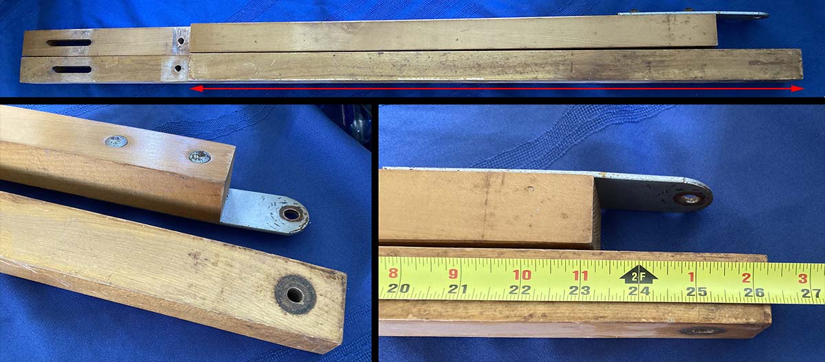 Note that older Leclerc looms had beater mechanisms that did not have this adjustment plate but they can be upgraded by cutting off the end of the swords and drilling a set of holes to attach the plate and using the shorter lag screw included. See the picture shown here for measurements.