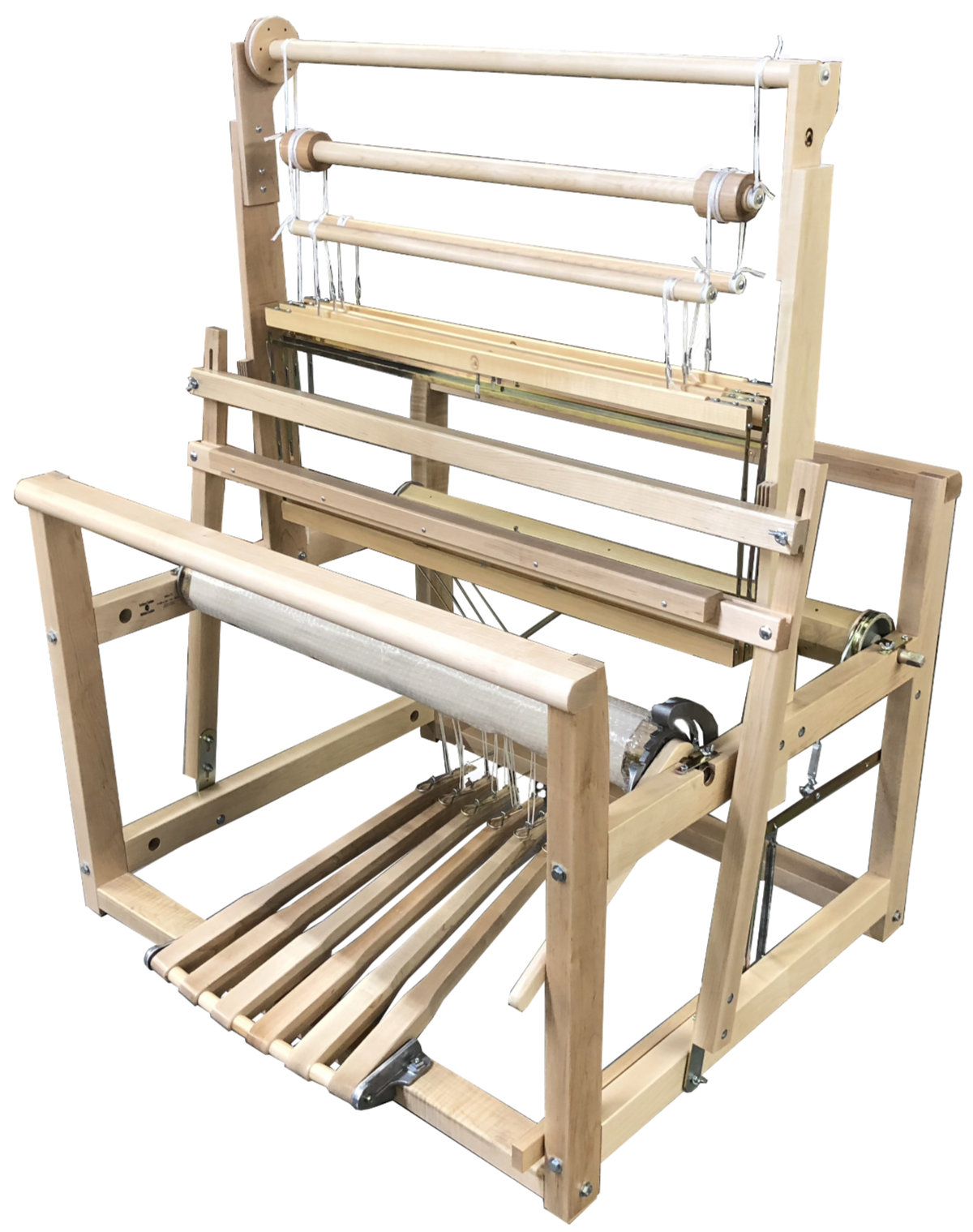 The counterbalance shed is wide and clean on every pick for the full range of 4 shaft weaves and the heavy duty cloth beam ratchet mechanism and warp beam friction brake enable the weaver to put a high tension on the warp. Both the breast beams and the cloth beam can be easily removed in a few minutes and optional rakes can be added to the warp beam to turn it into a Sectional Warp Beam. A selection of benches and other accessories are also offered.