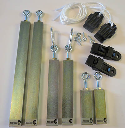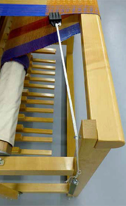 The kit consists of two sets of adjustable nylon clips, a pair of Texsolv cords and 3 pairs of weights that can be used alone or in combinations to achieve the desired pressure on the warp. Installation requires the addition of a set of eyescrews on each side of the loom. Instructions on the installation and use of this flexible temple system can be found here and a videe of it showing how easy it is to use can be found here.