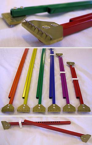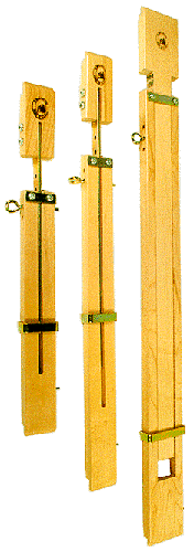 Leclerc temples (pictured left) are constructed of a traditional design using hardwood and have a set of horizontal pins that will not damage the shuttle race of jack looms. The company makes 6 sizes that cover fabric widths from 11 to 120 inches.
