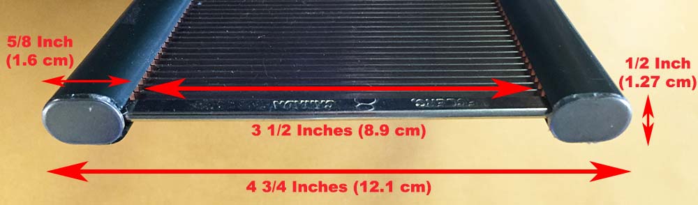 Custom length reeds that may fit looms by other manufacturers can be special ordered by using the part code for the next largest length and specifying the actual physical length the reed is to be cut to in the Comments section of our order form. It is the buyers responsability to verify the width and thickness will work with their loom. All reeds have inside width of 3 1/2" (8.9 cm) and outside width of 4 3/4" (12.1 cm). Click Here to see the full set of dimensions.