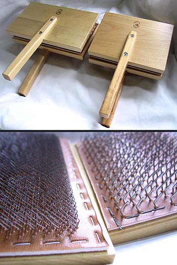 Made by Leclerc, these solidly constructed carders are shown in the picture to the left. The backs and handles are Maple hardwood and the wires are imbedded in a durable thick leather pad. Two versions are available depending upon the users requirements.