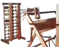 Leclerc floor looms have an octagonal Warp Beam that can be used for conventional warping with an Apron and Warp Rods or can be converted to Sectional Warping by attaching a set of 4 Sectional Beam Rakes that divide the beam up into these 1 or 2 inch sections. A Tension Box that maintains the tension on all the warp threads in the section is attached to the loom Back Beam above and a Spool Rack sitting behind the loom is used to hold the yarn tubes and/or spools that feed the warp through the Tension Box onto the Warp Beam. Note that the number of Tubes/Spools of yarn needed matches the number of warp threads used in each section.