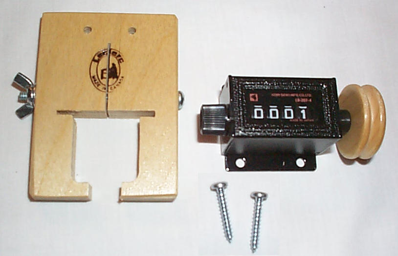 Mounted on the Tension Box (shown above), this Counter measures the length of the warp to ensure that all sections are the same length. The wood bracket attaches to the Tension Box with two screws (included) and the actual counter mechanism can be easily removed from the Tension Box and/or adjusted by simply loosening the wing nut shown.
