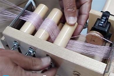 The Tension Box can also be used with the Warp Counter below when winding bobbins to hold the threads and to measure the length wound on in yards or meters. A Tension Box Extender can also be used to more accurately control the positioning of the warp threads by positioning another comb closer to the sectional beam.