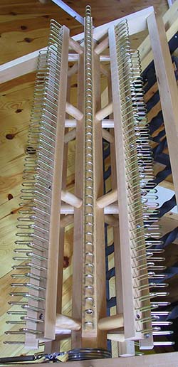 These warping boards are sturdily constructed out of Maple hardwood and are easily knocked down for storage. They can be used flat on a table or hung on a wall. The pegs are strong and are well recessed in the frame to prevent bending but can be easily removed to remove a tightly wound warp. (Note: Click on the picture to see a larger version.)