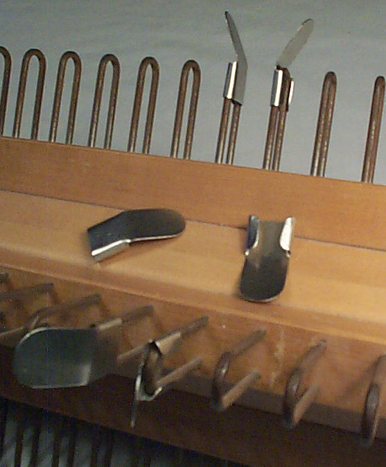This handy device is used to lock the shafts of a Leclerc loom together to keep them from moving while the loom is being threaded. They are of most use with a counterbalance design. (Click picture below to enlarge)