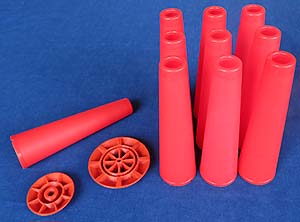 These plastic adapter ends are designed for use with the Leclerc Double-Ended Winder to wind yarn on plastic cones. They fit over each end of the cone and hold it in place on the winder. The holes on the end are the same size as the standard Leclerc bobbin so they will fit most older Leclerc winders. They may also fit other winders depending on their shaft size and configuration. These adapter ends are specially designed to fit the standard narrow plastic cones we sell. They do not work with cardboard cones. (Click on the pictures to enlarge)